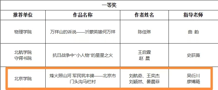 在纪念中国人民抗日战争暨世界反法西斯战争胜利 80 周年之际,为弘扬伟大抗战精神、引导青年学子厚植家国情怀,北航学生工作部于 2025 年 8 月至 9 月组织开展 “我讲抗战爱国故事” 主题短视频征集展示活动。近日,活动评选结果揭晓,北京学院薪火远航实践队创作的红色主题短视频凭借深刻的历史内涵、生动的叙事表达与真挚的情感共鸣,从众多参赛作品中脱颖而出,荣获一等奖!