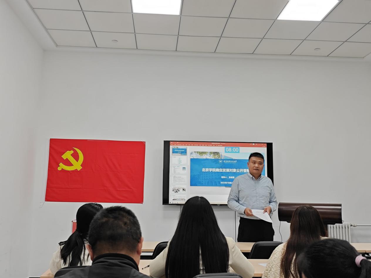 10月22日下午,北京学院党支部举行确定发展对象公开答辩会,会议由党支部书记吴衍川主持。北京学院全体师生党员及部分入党积极分子、群众参加了本次会议。