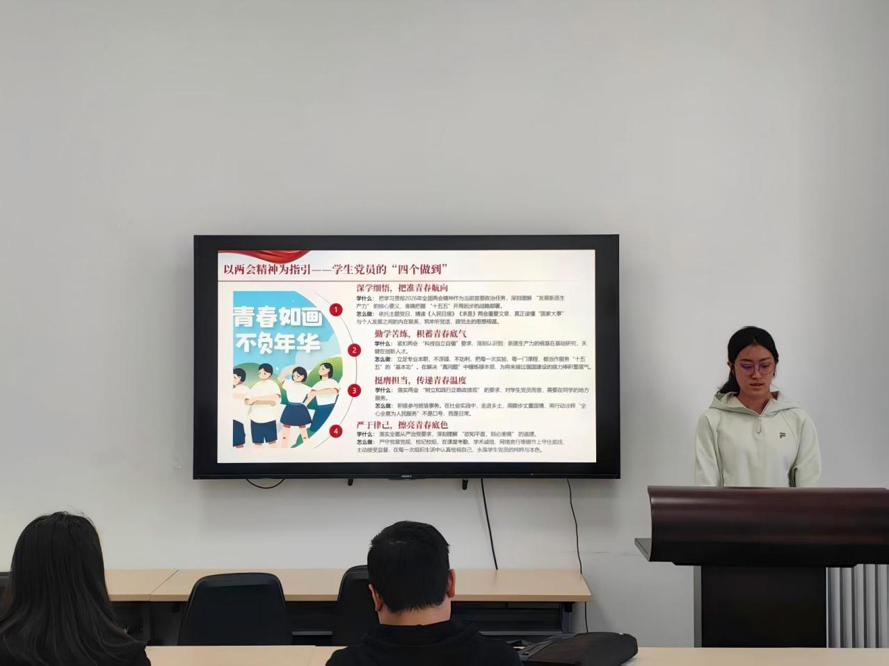 结合两会精神,马晶琳同志总结了学生党员要落实的“四个做到”:深学细悟把准青春航向,勤学苦练积蓄青春底气,挺膺担当传递青春温度,严于律己擦亮青春底色,将国家大事转化为实际行动。