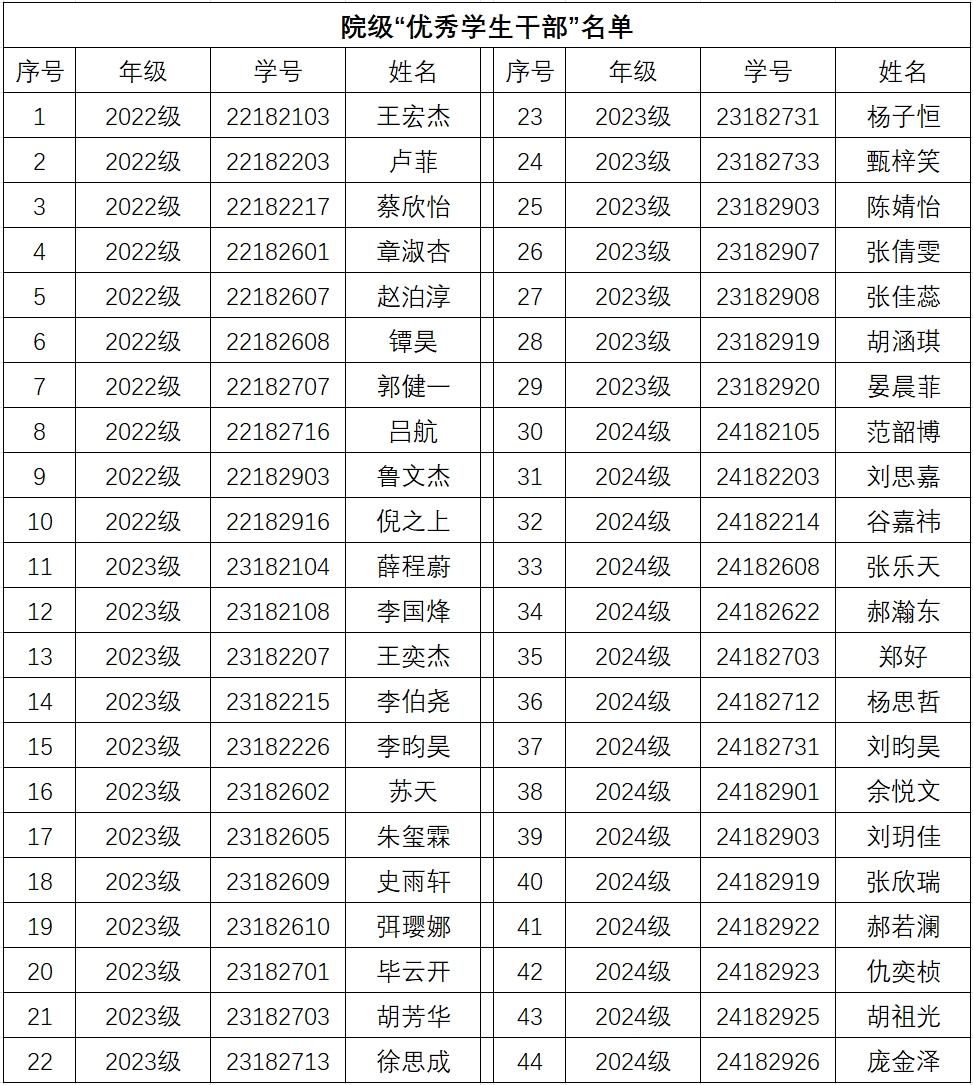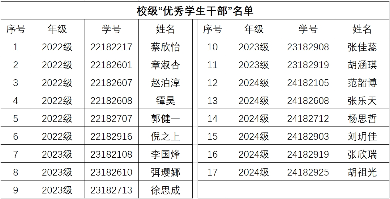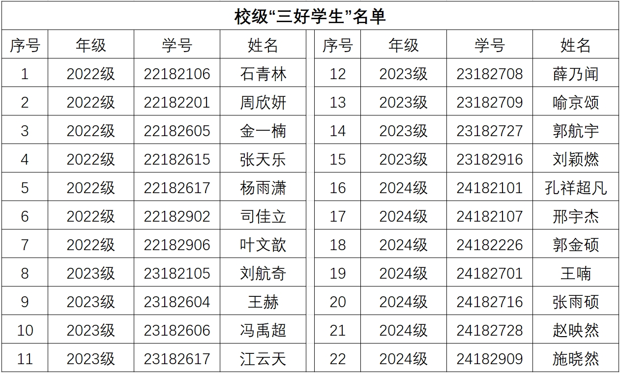 按照《关于评选2024-2025学年北京航空航天大学校级三好学生、优秀学生干部的通知》、《北京学院“三好学生”评选办法》和《北京学院“优秀学生干部”评选办法》的相关要求,学院秉持“公平、公开、公正”原则,经“学生本人申请—各班级及学生组织公开评定—学院学生工作小组复审”流程,评出2024-2025学年校级“三好学生”22人,院级“优秀学生干部”44人,其中推选校级“优秀学生干部”17人。现将评选结果公示如下: