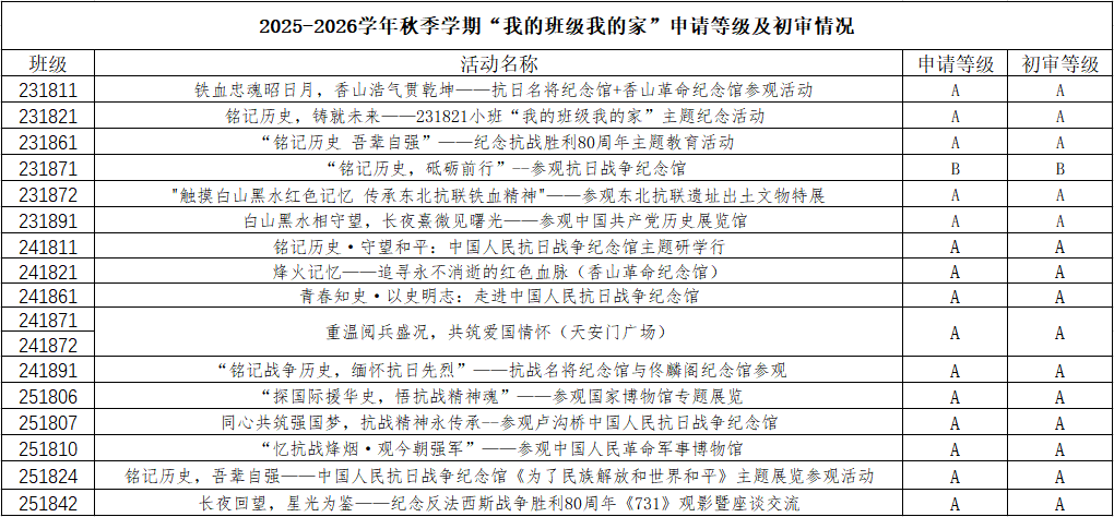 为提高班级凝聚力,加强班集体建设,鼓励各班积极组织开展“我的班级我的家”活动,学院各年级辅导员对各小班上报的《“我的班级我的家” 主题活动申请表》进行初审。本次共收到 17 个小班的活动申请,其中 16 个小班初审通过;通过的班级中,初审等级为 A 等级的有 15 个,B 等级的有 1 个。